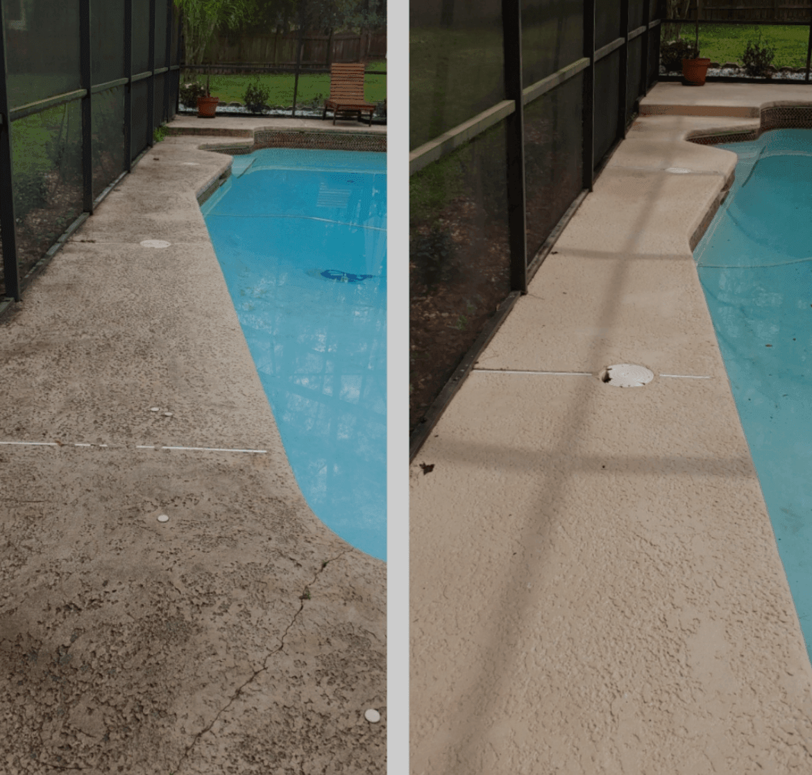 Pressure washing pool cages and decks is a thorough cleaning service that utilizes high-pressure water jets to remove dirt, algae, mold, and grime from surfaces surrounding a pool area. This process revitalizes the appearance of pool enclosures and decks, restoring them to their original, pristine condition. It also helps prevent slippery surfaces and promotes a safer environment. By eliminating built-up dirt and contaminants, pressure washing enhances the overall aesthetic appeal and longevity of these outdoor spaces, ensuring they remain inviting and enjoyable for both residents and guests. This service is an integral part of regular pool maintenance, contributing to a clean, hygienic, and visually pleasing pool area.